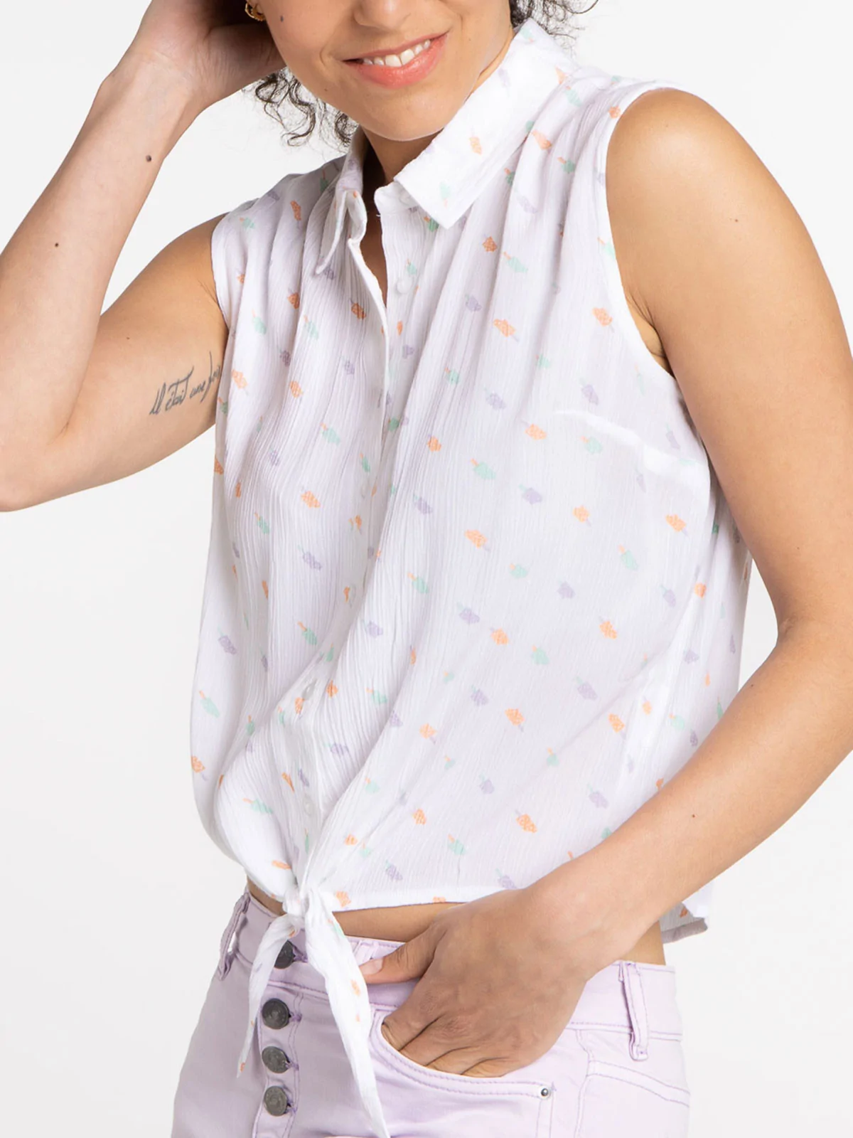 Craquez pour cette jolie chemise sans manches ! On adore son imprimé glace et son ouverture boutonnée. Mention spéciale pour ses 2 pans à nouer qui en font une pièce unique.