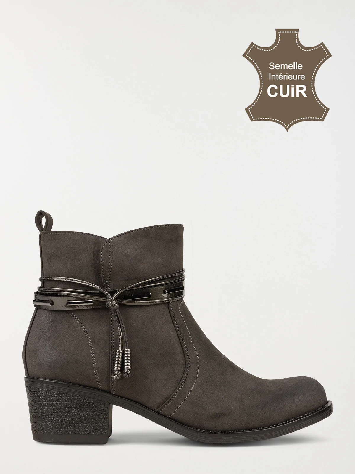 Ces bottines vont vous séduire par sa ligne sobre et épurée. Elles sont réhaussées par une matière suédine et de brides nouées. Avec leurs fermetures zippées, elles permettent un enfilage rapide. Un modèle à porter avec une robe longue.