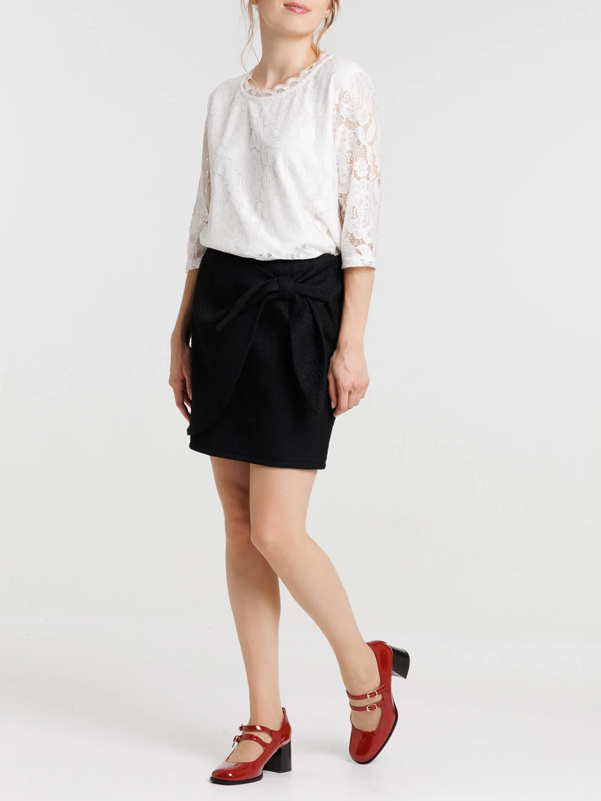 On ne s'en prive pas et on porte cette jupe courte effet portefeuille sans modération cette saison. Elle a tout pour plaire : une matière tweed et un bel imprimé en relief. Plus qu'à succomber !