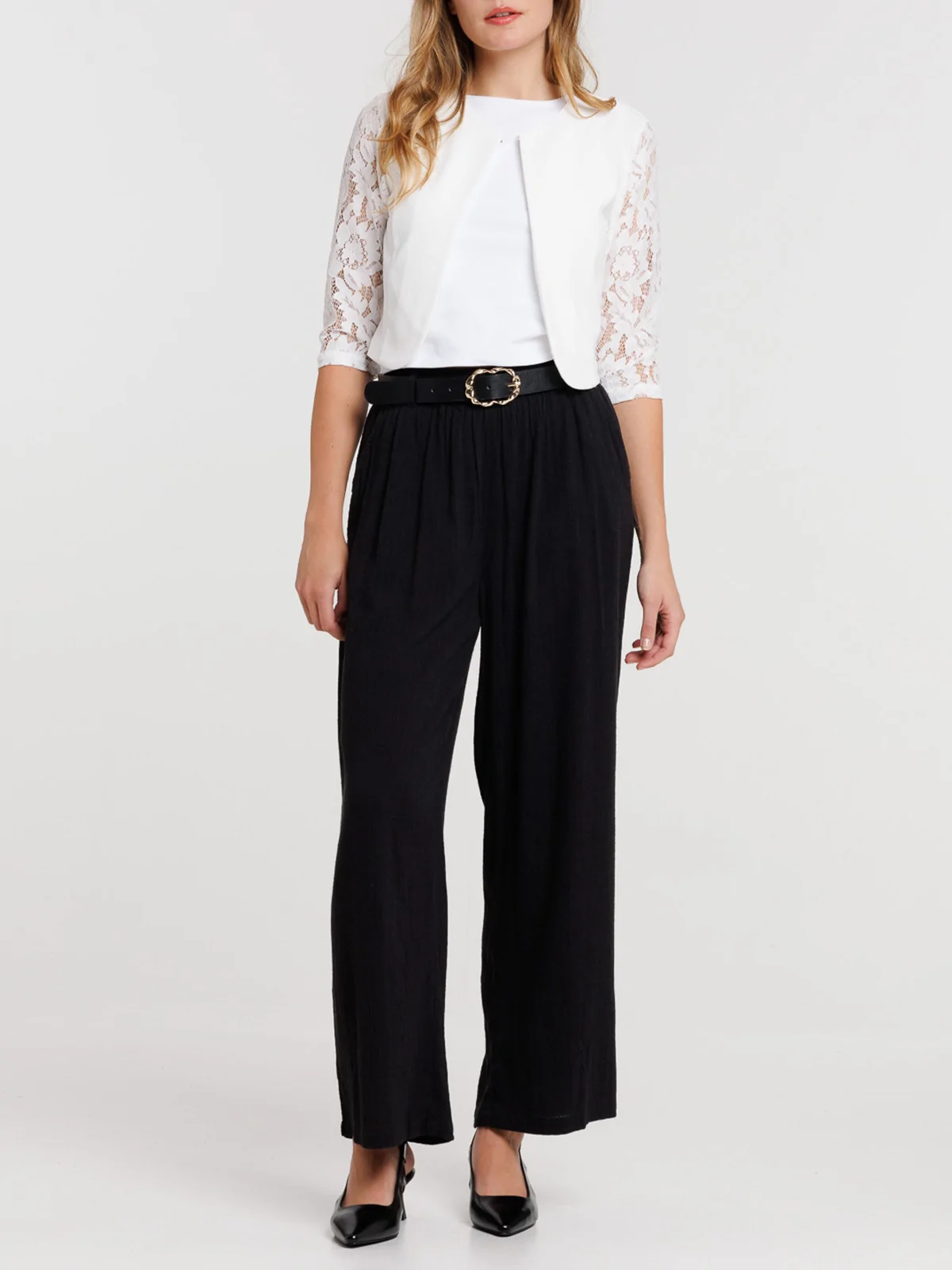 Cette veste allie élégance et féminité. Sa coupe courte met en valeur votre silhouett, tandis que ls manches en dentelle ajoutent une touche délicate et sophistiquée. Elle est parfaite pour sublimer une robe ou un top. Idéale pour les occasions spéciales !