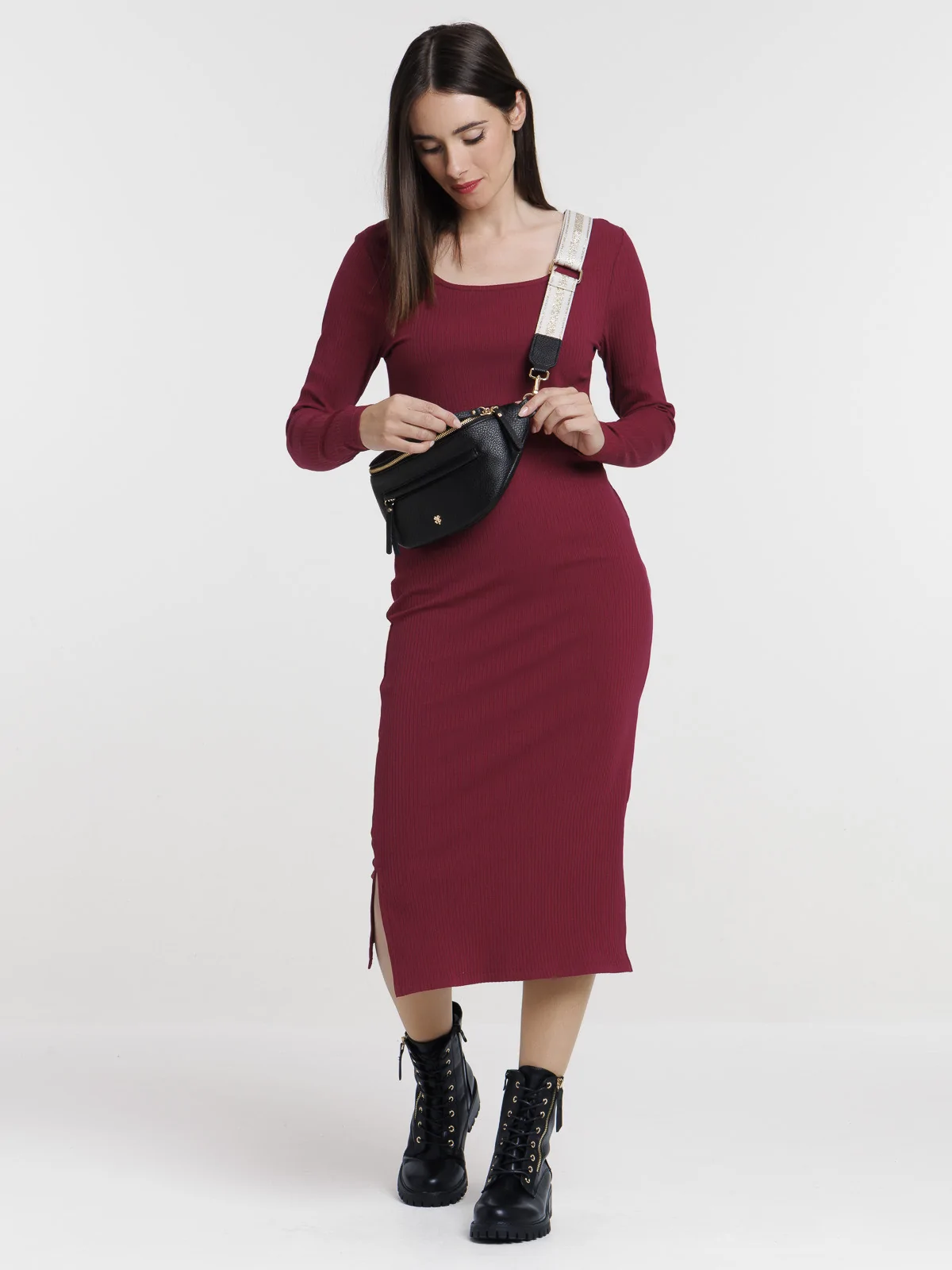Robe longue côtelée lie de vin femme