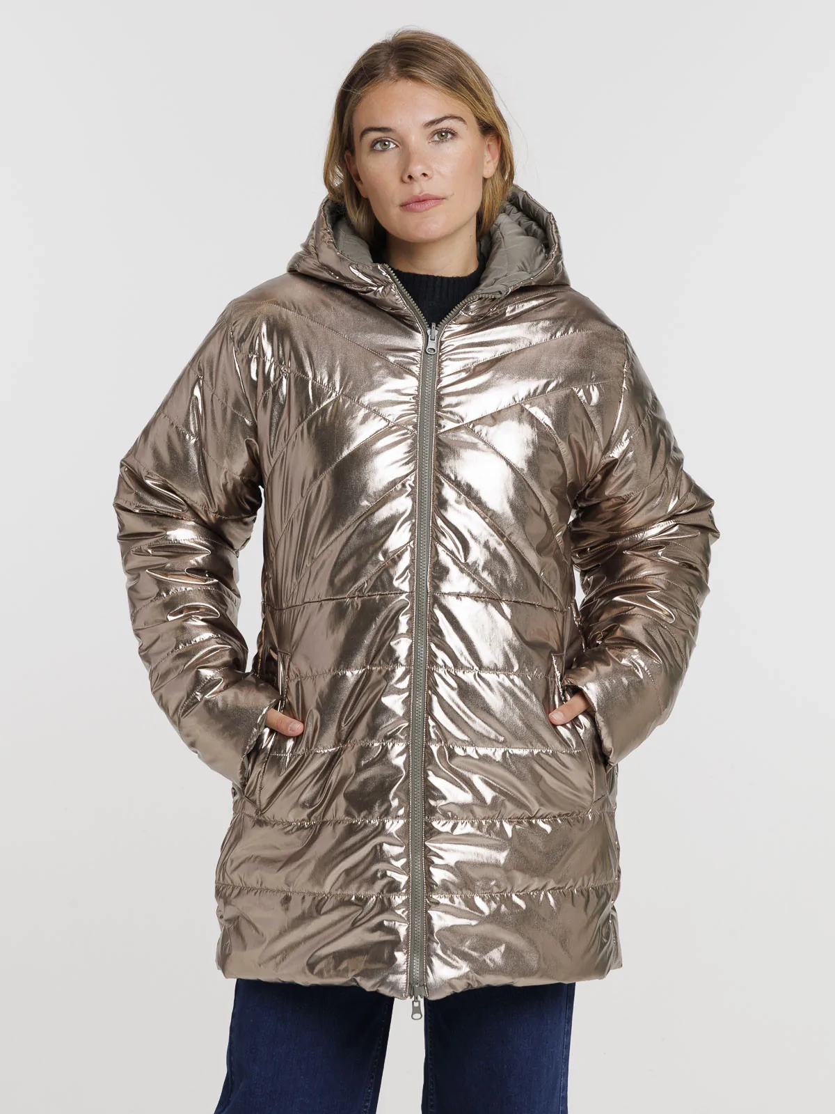 On vous emmène en balade avec cette jolie doudoune à capuche. Ce modèle réversible vous permet de changer de style en un clin d'oeil grâce à son coloris intemporel d'un côté et son coloris métallisé de l'autre. Investissez dans cette pièce-phare de la saison !