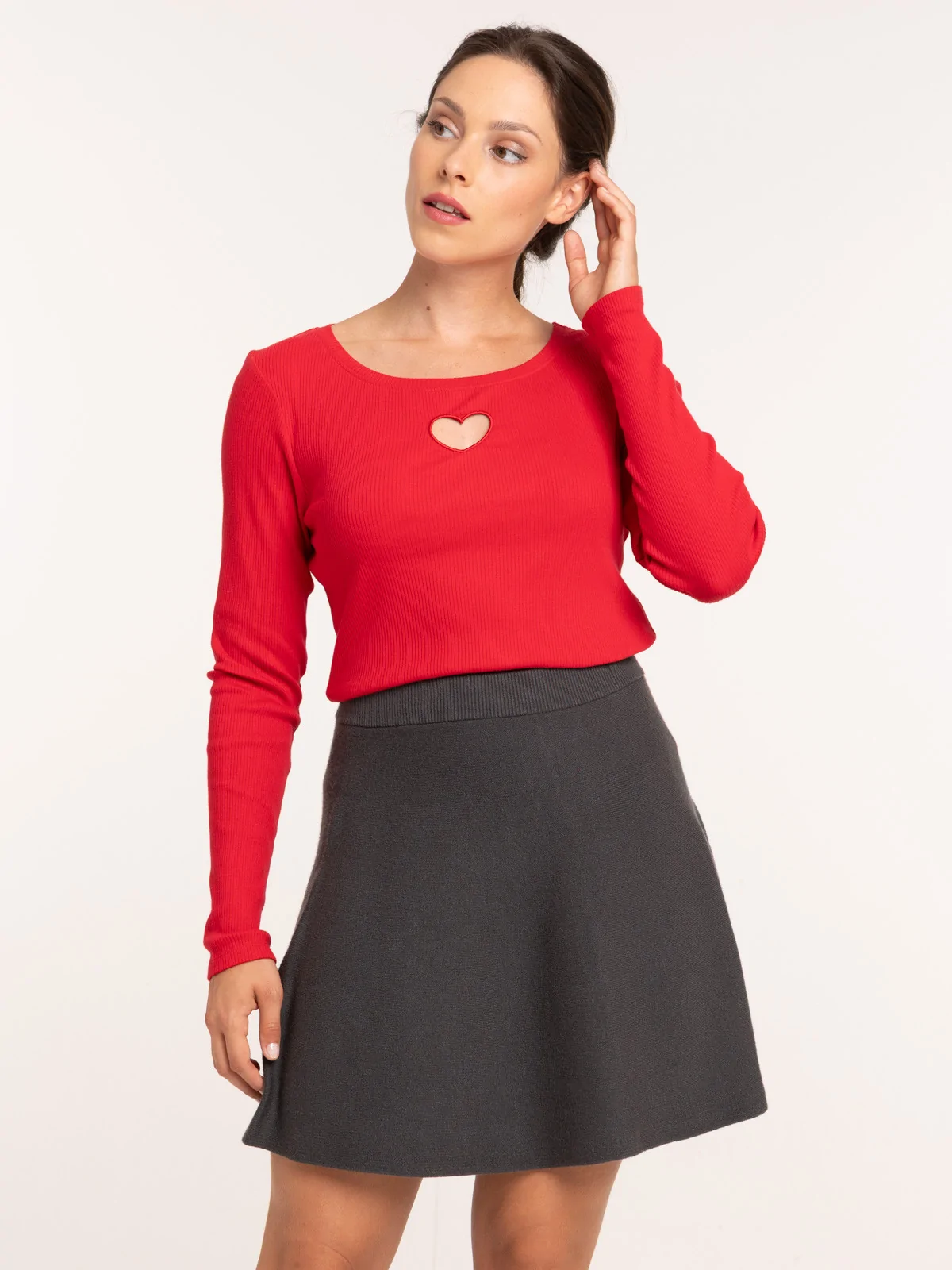 Ce t-shirt uni avec son coeur ajouré sur le devant et sa matière côtelée, on adore ! Facile à coordonner à vos pièces du dressing.