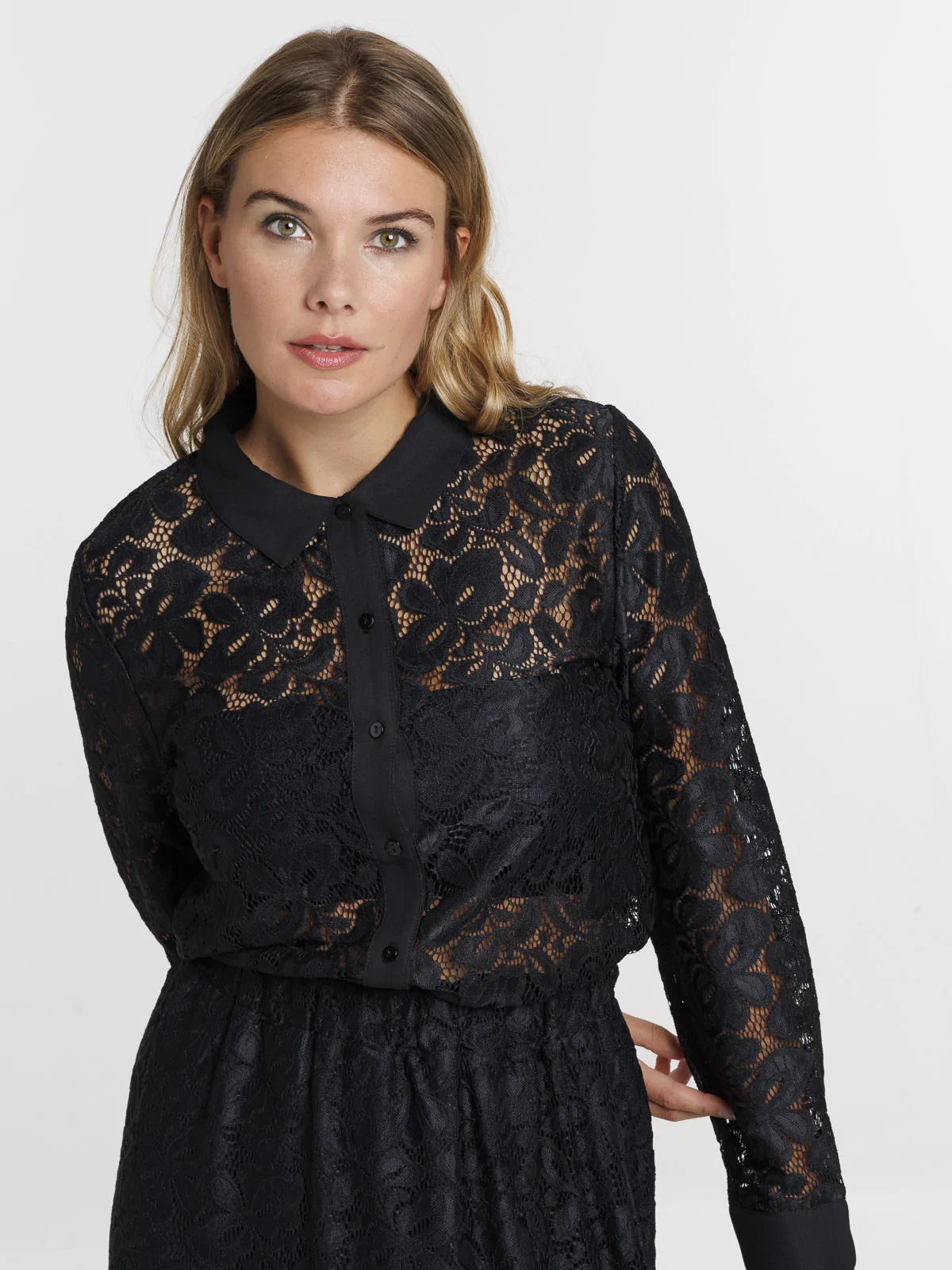 Cette chemise est de toute beauté avec sa dentelle fleurie transparente. Ce modèle est super charmant accompagné d'un débardeur noir à bretelles, d'une jupe droite et d'une paire d'escarpins.