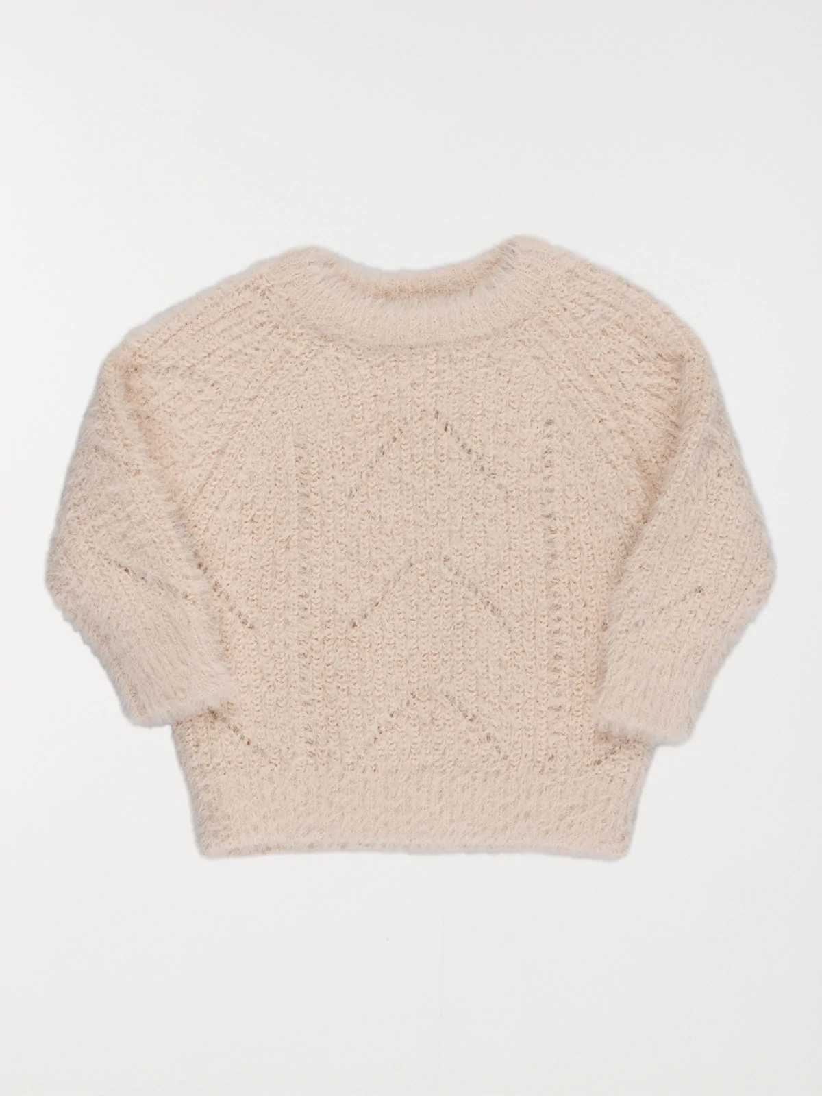Tricoté dans une maille douce, ce pull réchauffera toutes les tenues des petites filles. Il arbore une maille fantaisie avec des ajours raffinées et un col rond.