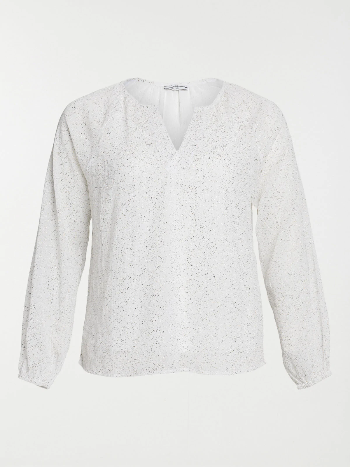 Pour les fêtes de fin d'année ou toutes autres grandes occasions de briller, optez pour cette sublime blouse ! Elle est illuminée par des paillettes sur l'ensemble du modèle. On lui associe un pantalon large et des escarpins.