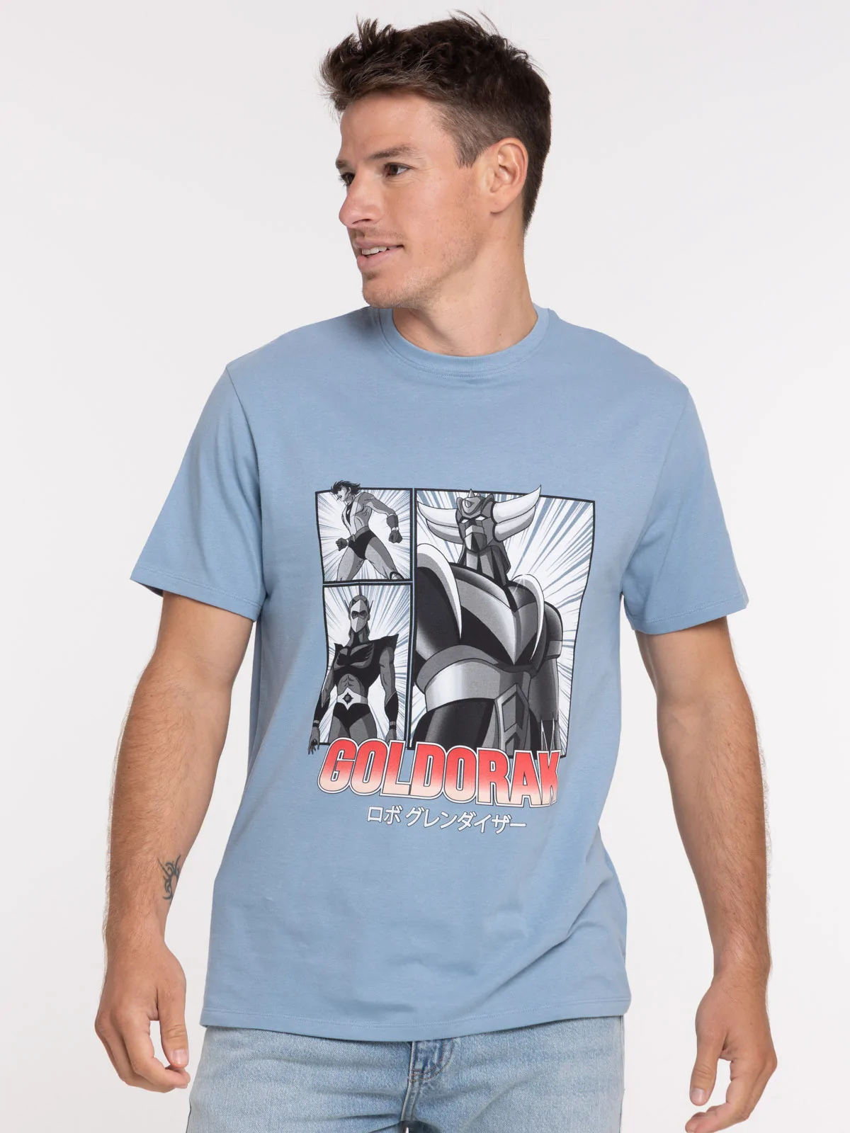 On est fan du motif "Goldorak" imprimé sur le devant de ce t-shirt homme. Notez son coloris denim stone, facile à coordonner avec tous les bas du dressing !