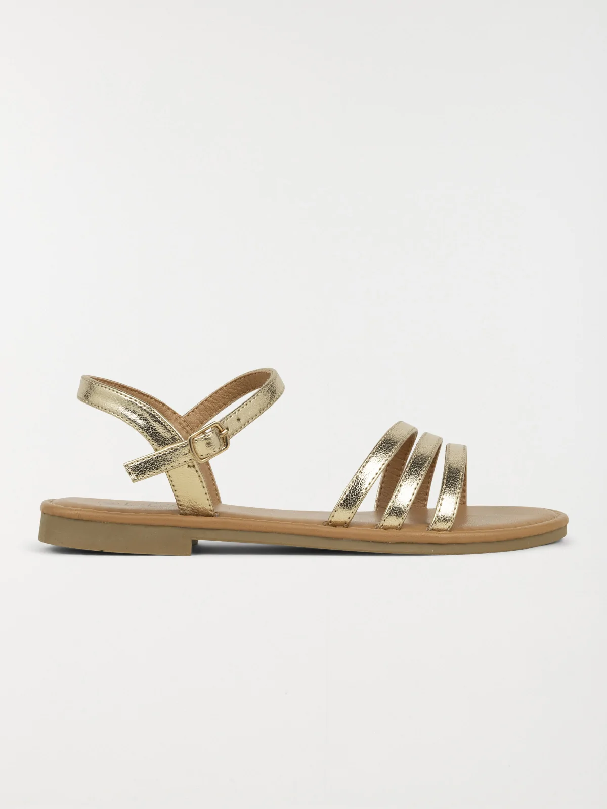 Ajoutez une touche de brillance à vos tenues d'été avec ces sandales plates dorées au design épuré ! Dotées de trois fines brides à l'avant, elles offrent un maintien discret et une allure féminine parfaite pour les journées ensoleillées.