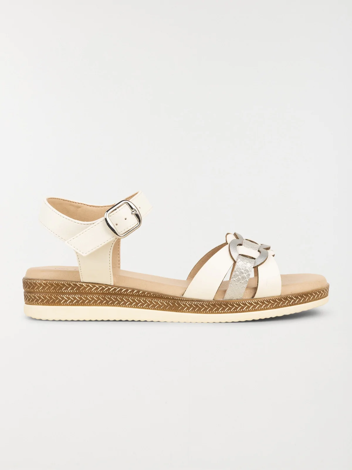 Alliez style et confort avec ces sandales pour femme, parfaites pour la belle saison ! Elles se distinguent par leur bride avant tressée aux finitions mates et légèrement irisées, pour une touche d'élégance discrète. La semelle légèrement compensée avec motif en relief apporte un bon maintien et la bride à boucle réglable à la cheville assure un ajustement parfait.