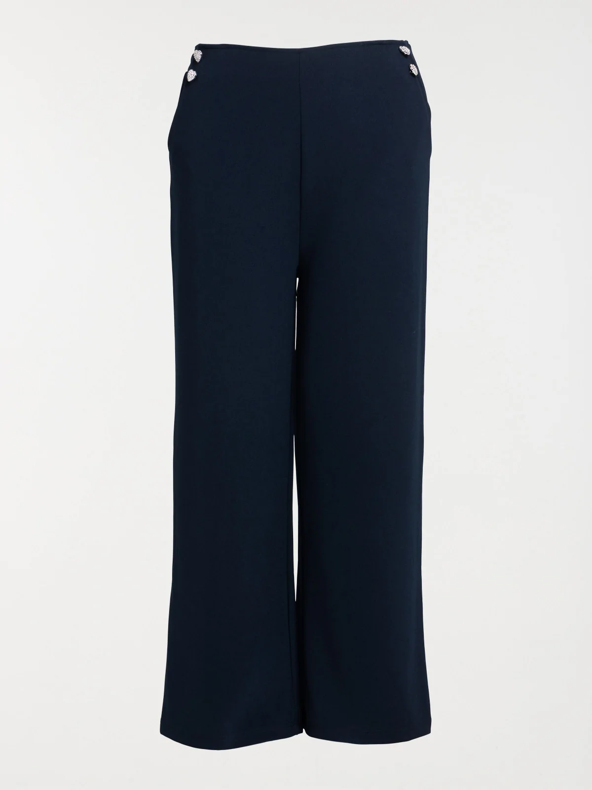 Ce pantalon affiche une allure particulièrement élégante avec ses gros boutons métalliques sur le devant. On lui associe une blouse et une paire de baskets.
