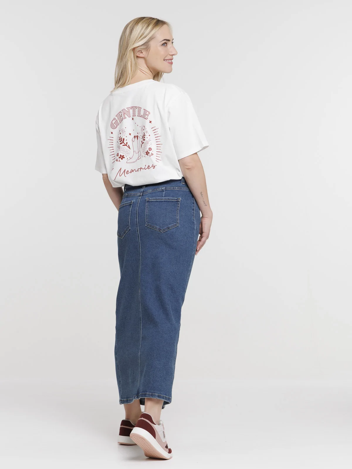 Ce tee-shirt avec son imprimé au dos donne un style vraiment tendance. On l'aime avec un jean taille haute ou une jupe en jean par exemple.