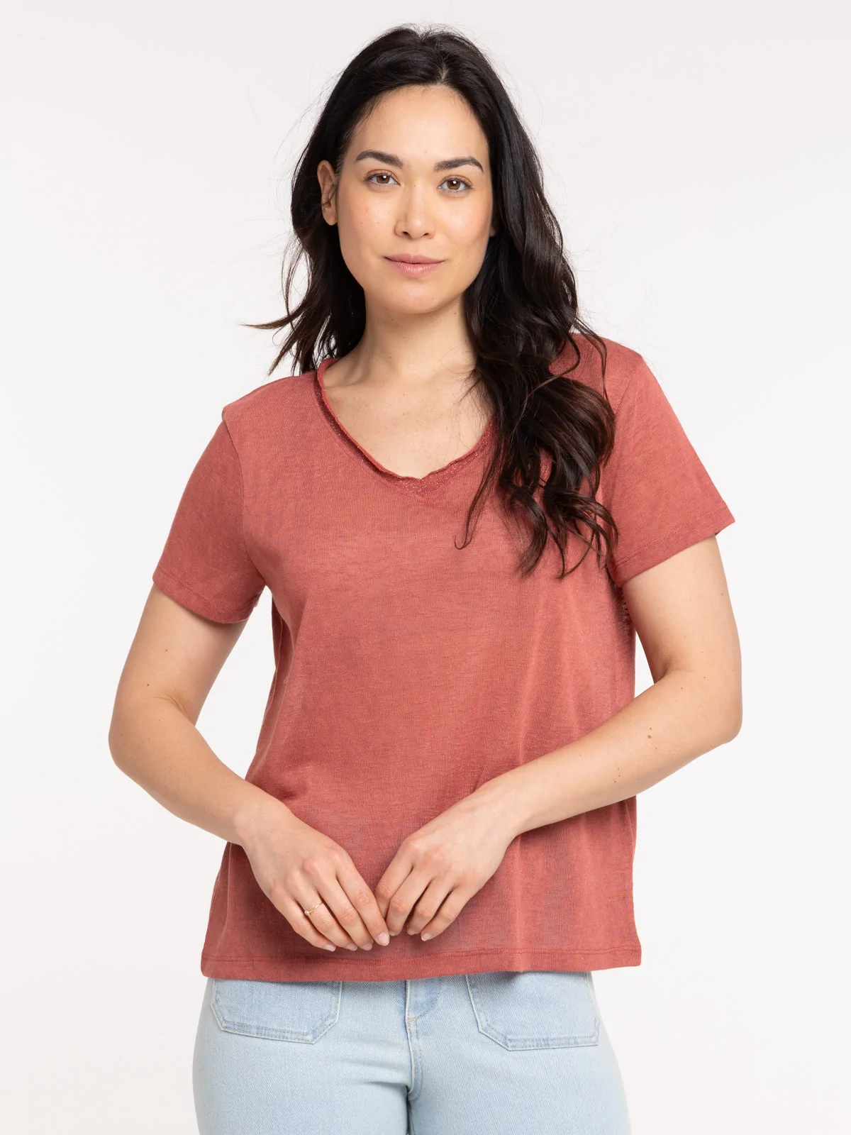 T-shirt col V marsala femme