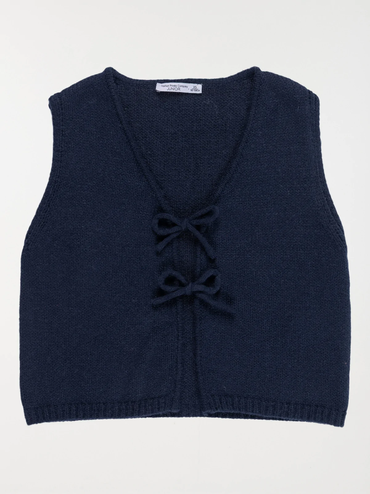 Adorable et facile à porter, ce gilet sans manches est la pièce idéale pour compléter une tenue avec style et légèreté. Son petit plus ? Ses noeuds à nouer sur le devant pour une finition délicate et pleine de charme. A superposer sur une robe, une blouse ou un t-shirt.