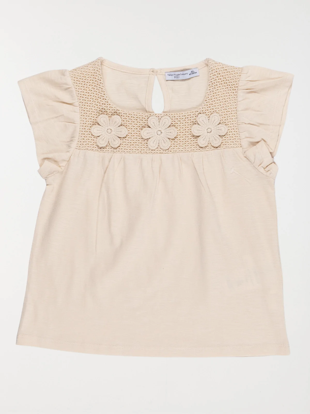 Des manches volantées, des fleurs brodées, de la maille crochet et le tour est joué ! Ce t-shirt est parfait pour compléter le dressing des filles.