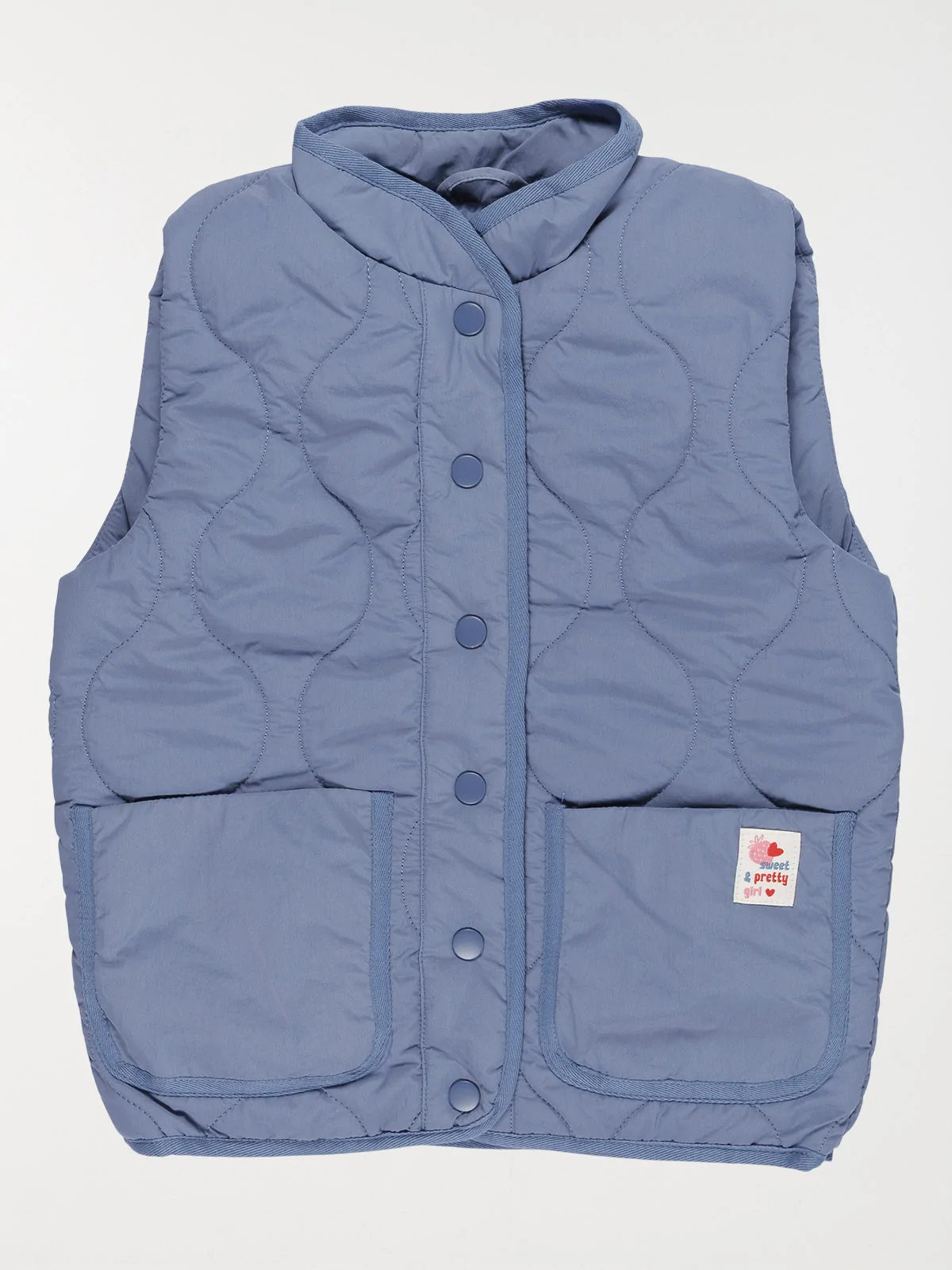 Idéale pour la mi-saison, cette doudoune sans manches apporte chaleur, confort et une bonne dose de style ! Son coloris indigo est rehaussé d'une étiquette cousue sur la poche avec le message tendre "Sweet & Pretty Girl*", accompagnée de petits motifs fraise et coeur ultra craquants.