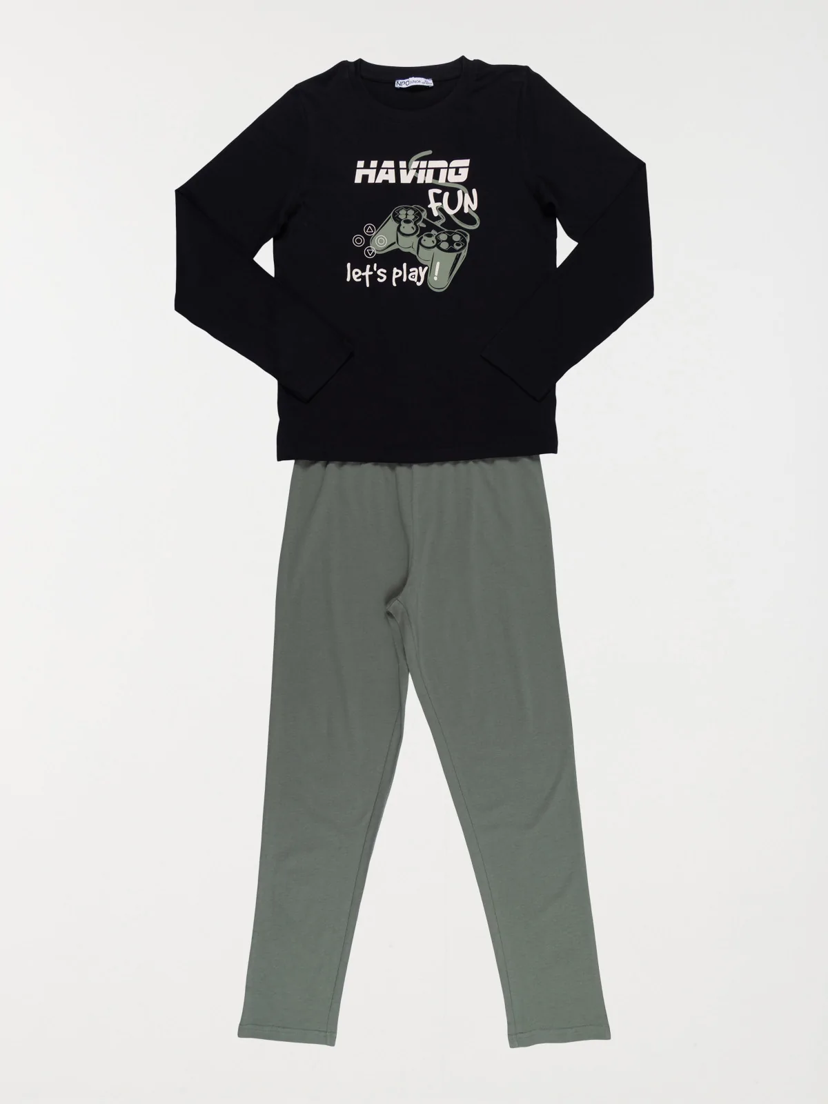 On se met en mode cocooning avec ce pyjama ! Il se compose d'un haut à manches longues et d'un pantalon muni d'une taille élastique.