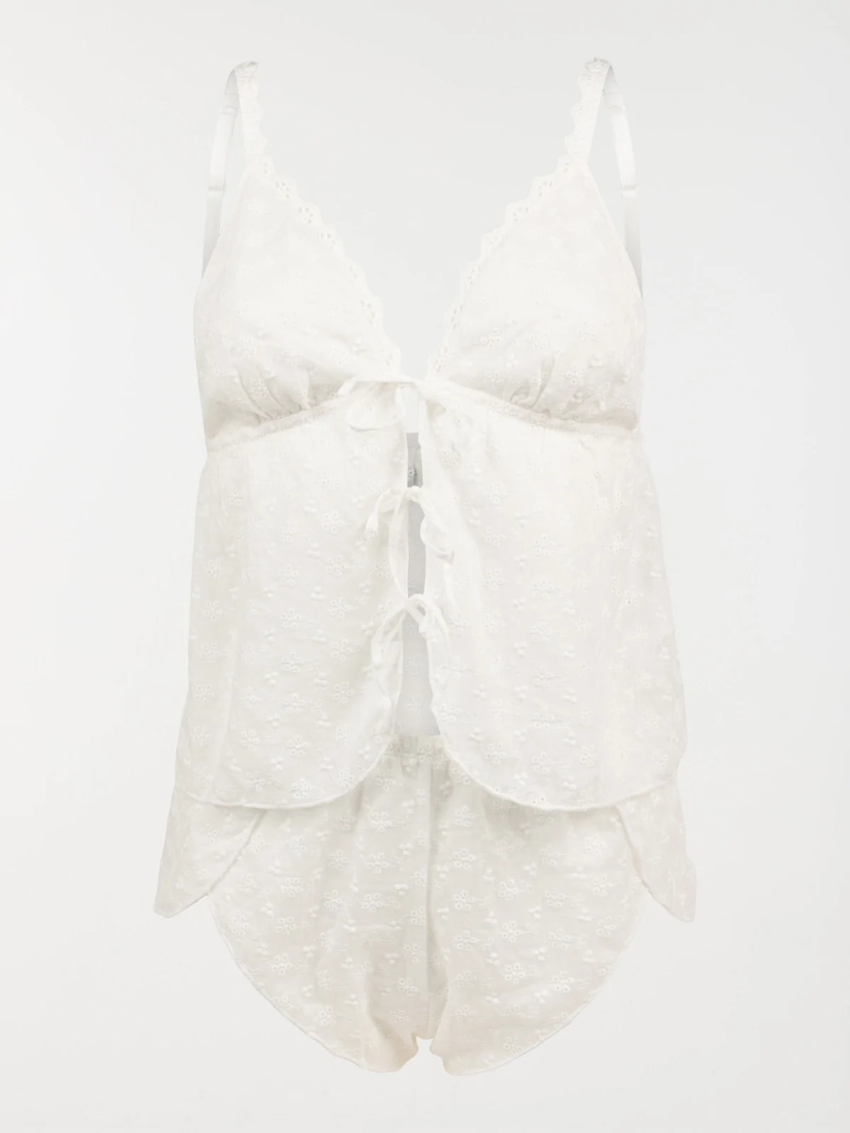 Laissez-vous séduire par cet ensemble de nuit en broderie anglaise et ses noeuds sur le devant... Un pyjacourt très féminin, on adore !