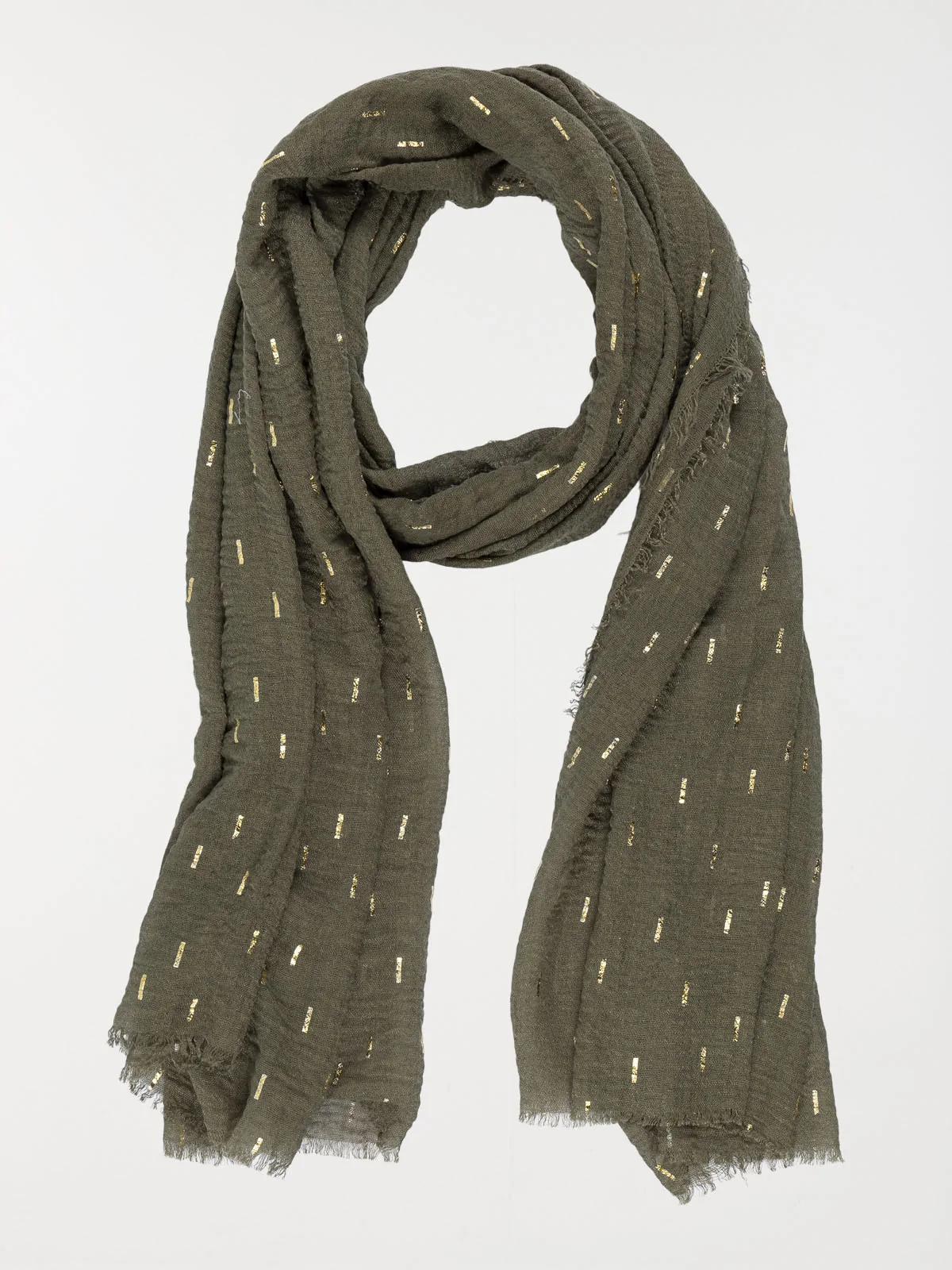 On craque pour ce foulard femme avec ses imprimés traits de couleur dorée et aux détails frangés aux extrémités ! On le porte avec délicatesse toute la saison.