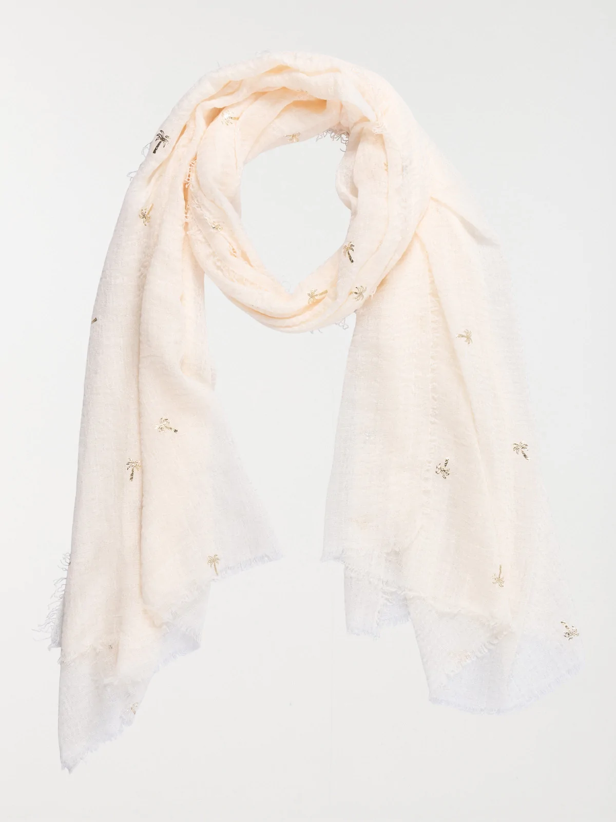 On craque pour ce foulard femme avec son motif palmier doré et ses détails frangés aux extrémités ! On le porte avec délicatesse toute la saison.