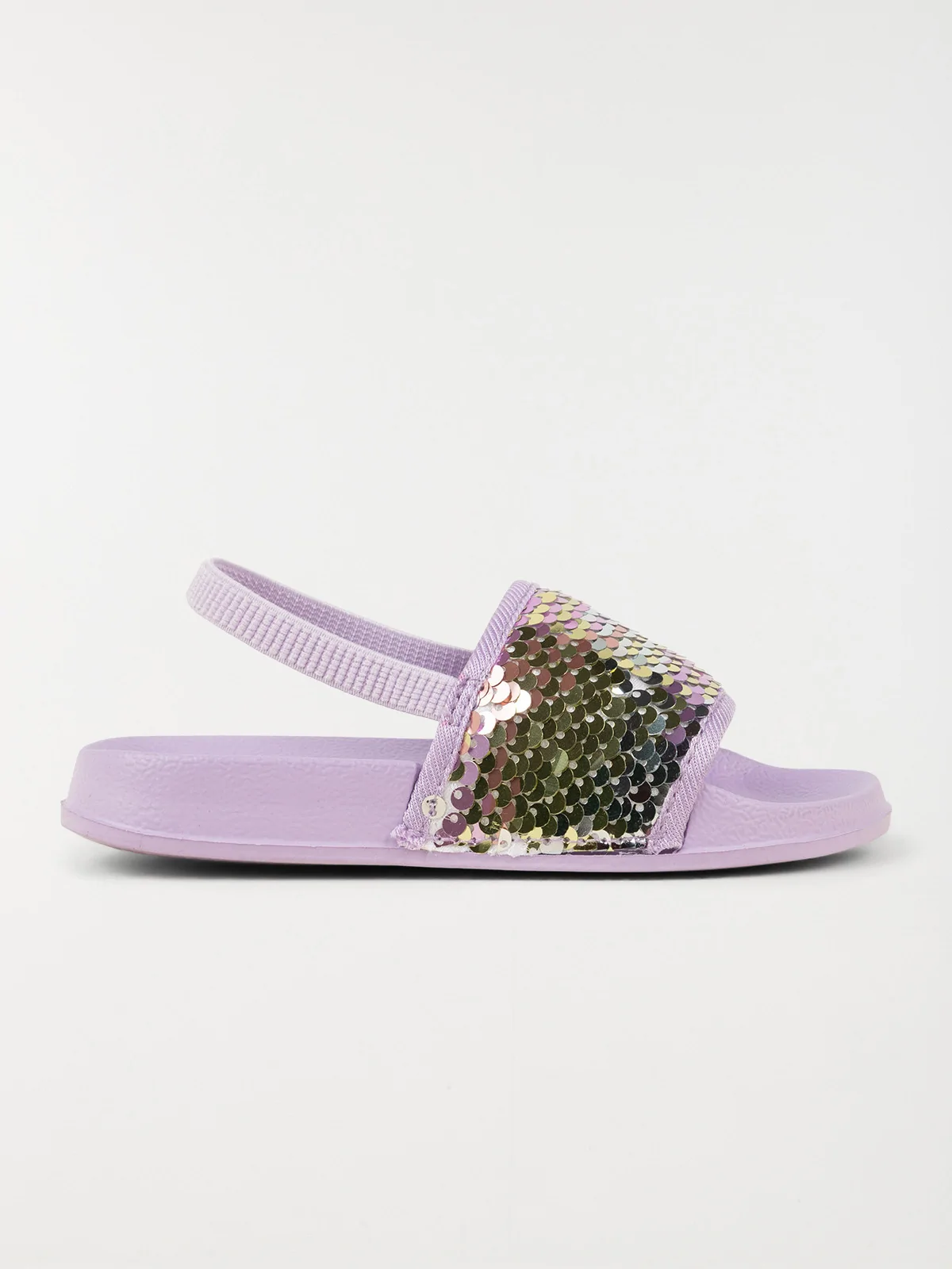 Indispensable pour la piscine ou pour la plage ! Cette paire de claquettes marque sa fantaisie par ses sequins sur sa large bride.