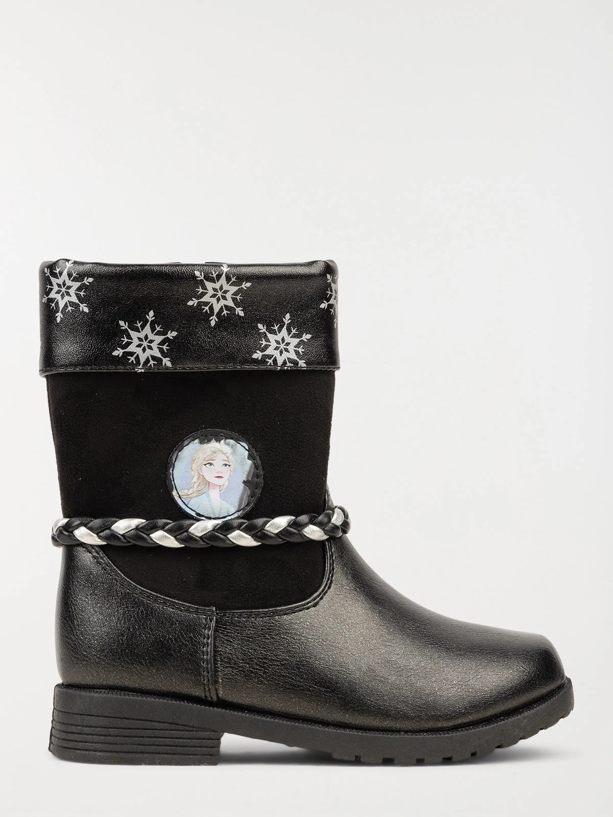 • Bride tressée entourant la cheville, revers avec motif flocon