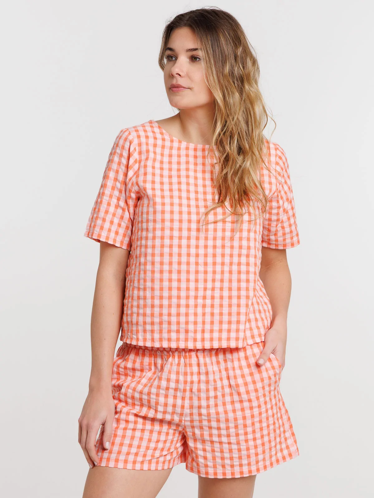Cette blouse réversible vous offre deux looks en un grâce à son motif vichy et ses nœuds à nouer. Parfait pour varier vos tenues avec élégance et originalité. On lui associe le short assorti pour un total look.